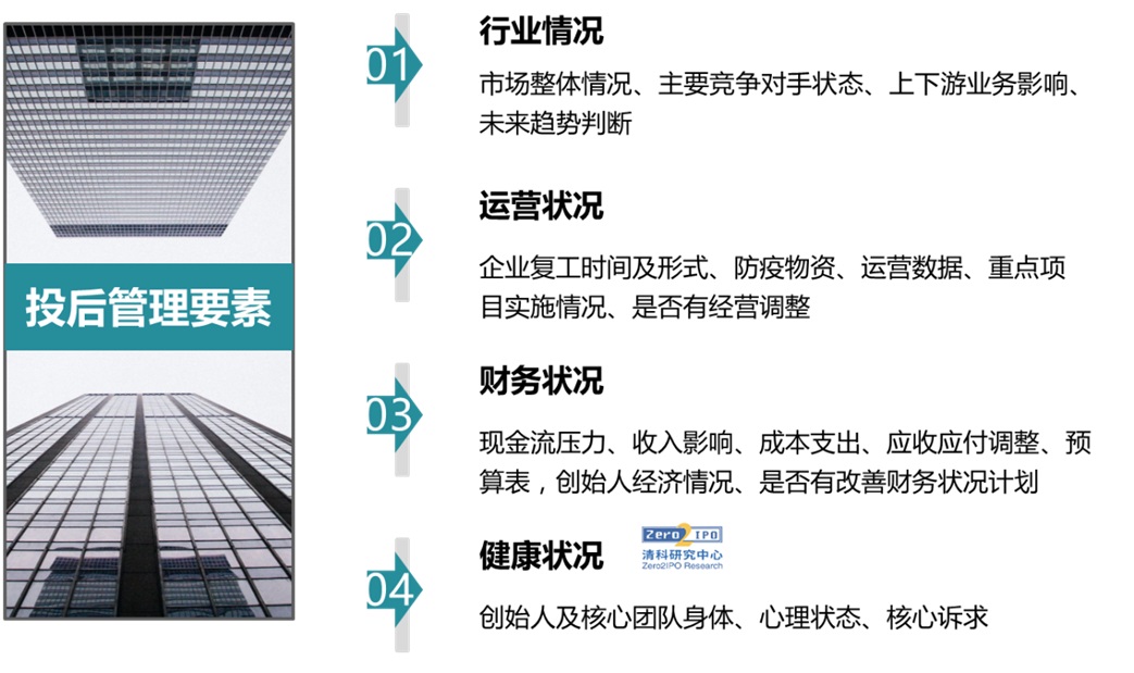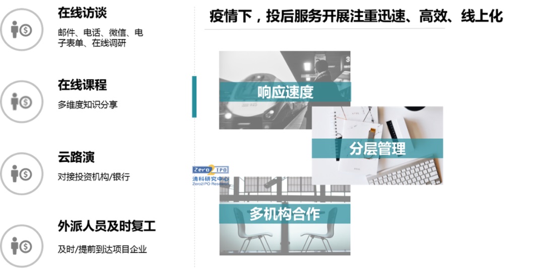 在严酷的物理隔离之下,,,,,,机构投后效劳开展注重高效化、线上化。。。。。。通过在线访谈、电子表单等形式网络被投企业信息;;;;通过线上课程解答众多创业企业需要面临的共性问题;;;;原本线下举行的资源对接会、路演也转为了“云路演”,,,,,,为企业高效对接资源。。。。。。针对有外派职员的并购类、工程类项目,,,,,,外派职员实时甚至提前到岗,,,,,,加速企业清静复工复产。。。。。。