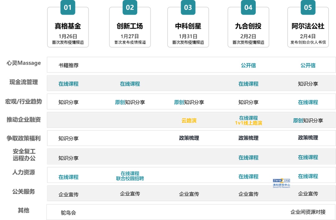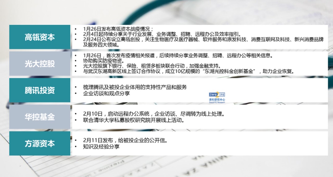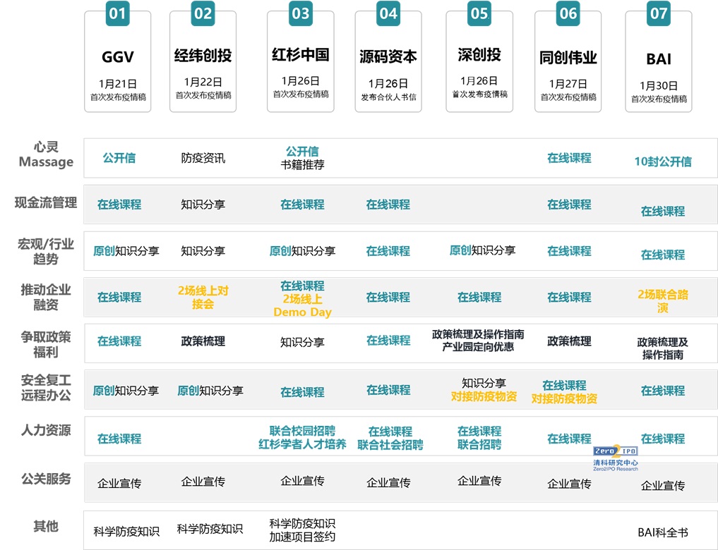 VC机构是投后效劳系统较为健全的一类。。。。。。面临突发状态,,,,,,VC机构投后效劳启动迅速,,,,,,例如1月26日,,,,,,红杉中国即宣布了《红杉中国给成员企业的一封信》,,,,,,发出对被投企业的三个提醒。。。。。。红杉、源码资源、GGV等机构均迅速开展了系列课程,,,,,,涵盖远程办公协作、劳动规则培训、疫情时期的融资战略、疫情时代的财务危害治理以及疫情时期的人力资源优化等方面。。。。。。红杉、经纬、BAI率先实验了线上路演形式;;;;红杉、深创投、源码资源资助企业解决春招难题。。。。。。