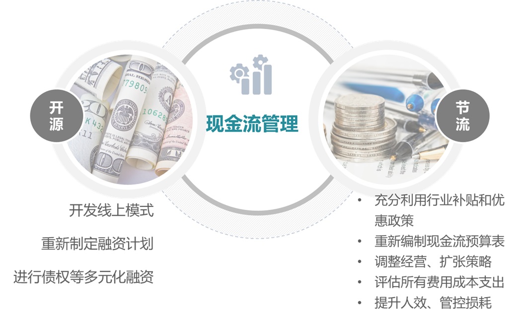 疫情之下,,,,,,企业现金流泛起危;;;,,,,,,“开源节约”、“留足12个月运营资金”的呼声一直于耳。。。。。。“开源”方面,,,,,,勉励企业跳出原有运营模式,,,,,,评估打造线上产品的可能性,,,,,,同时重新制订融资妄想,,,,,,周全相识“股权”和“债权”融资方法,,,,,,调解估值预期。。。。。。“节约”方面,,,,,,充分使用行业津贴和优惠政策,,,,,,例如延迟缴纳社保等,,,,,,实时调解谋划战略,,,,,,降低扩张速率和津贴力度,,,,,,体例未来一年现金流预期表,,,,,,实时处置惩罚应收应付,,,,,,评估销售、薪酬、房租等用度项目,,,,,,制订合理降本妄想。。。。。。